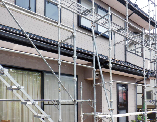 足場を組んで安全な現場を作ります。そして塗料が飛び散ってまわりが汚れないように、飛散防止ネットで養生します。